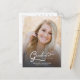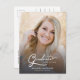 Elégant script moderne grad photo Graduation Faire-part. Doté d'une photo pleine dimension sur le devant avec une superposition de texte blanc et d'une photo sur le côté arrière avec des détails optionnels.