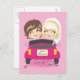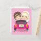 Le marié et la mariée conduisant une automobile rose avec une plaque d'immatriculation 'jeune marié' et des canettes attachées au pare-chocs. Célébrez votre jour de mariage avec ce design mignon et original de Kakigori Studio.