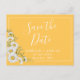 Jolie Enregistrer la date annonce carte postale caractéristiques aquarelle blanc marguerite coin sur jonquille jaune arrière - plan avec des blocs de texte personnalisables blancs dans les polices modernes. Ajoutez du code QR personnalisé et d'autres informations sur le dos.