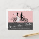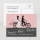 Mariée à vélo et mariée de chambre mignonne Tandem enregistrer la carte de date dans les tons gris rose avec une mariée en robe mariage avec un petit coeur rouge sur le voile et un marié dans son costume.. mariage sur mesure étonnant enregistrer la date cartes postales.. ajouter votre propre texte .. produits mariages de créateurs de Ricaso