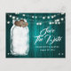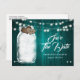 Carte postale de mariage romantique rustique turquoise pour enregistrer la date, avec un bocal et deux coeurs en toile de jute sur un fond en bois rustique orné de guirlandes lumineuses.