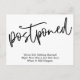Si vous préférez audacieux et simple, ceci pourrait être la carte de faire-part pour vous. L'avant comporte un en-tête graphique que j'ai conçu en utilisant une police d'écriture moderne et décontractée, qui dit "Postponed". En bas, il y a un message joyeux que vous pouvez éditer, qui déclare votre nouvelle : "Nous nous marions toujours ! En ce moment, nous ne sommes tout simplement pas sûrs de quand cela arrivera." Utilisez les champs modèles pour ajouter vos données personnelles et modifier n'importe quel de mes projets de texte pour répondre à vos besoins et à votre situation.