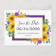 Ce beau design moderne et rustique présente de luxuriants bouquets de tournesols, de roses violettes royales et de verdure comprenant des feuilles d'eucalyptus et des fougères sur le devant. Derrière les bouquets se trouve un rectangle violet foncé et, à l'avant, une zone blanche à bordure dorée avec le texte personnalisable en violet foncé dans une typographie élégante et tendance en script et sans empattement. Le dos de la carte présente des superpositions florales transparentes dans les coins et plus de texte personnalisable, y compris une adresse de retour pour simplifier votre processus d'envoi postal. Vous pouvez personnaliser cet article pour votre événement spécial en modifiant le texte dans le modèle de produit.