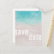 Carte de mariage tropical sur la plage aquarelle à conserver. Une simple représentation aquarelle d'une plage tropicale avec du sable blanc rosé et des eaux turquoise sert de toile de fond à cette annonce de mariage élégante et moderne. La typographie audacieuse et en détresse donne au design un look rebelle. Ajoutez vos détails de mariage et toute information supplémentaire à la carte postale et envoyez-la à votre famille et à vos amis.