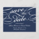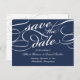 Élégant enregistrer les cartes postales de date en bleu marine et blanc classique fonctionnalité embellisé script de calligraphie pour un look classique et formel. Personnalisez l'envers avec les détails de votre mariage, y compris les noms, la date, l'emplacement et des informations supplémentaires comme votre site Web mariage. Espace prévu pour votre adresse de retour pré-imprimée.