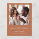 Cette carte postale simple et minimaliste Save the Date présente une photo carré au-dessus des mots "Save the Date" dans un élégant script d'écriture manuscrite blanche, suivie des noms du couple, la date du mariage et la ville en sans serif font sur un arrière - plan en terre cuite. Ajoutez une deuxième photo horizontale et un message plus détaillé avec des informations supplémentaires sur le verso, ainsi que votre adresse de retour.