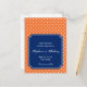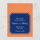 Cartes de faire-part de mariage à motif à pois orange et blanc monogrammé avec accent bleu royal. Petits pois blancs sur fond orange et au milieu, un rectangle bleu royal pour ajouter votre texte.