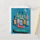 Retro Futuristic Enregistrer La Date Carte postale Mariage. Envoyez ce panneau d'affichage vintage et amusant en bleu turquoise et rose avec une fusée, des étoiles et des chats noirs à votre famille et à vos amis pour annoncer vos nouveautés. Le dos de la carte postale offre beaucoup d'espace pour un message supplémentaire. Conception rétro créée à l'aide de kittl.com.