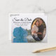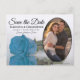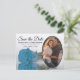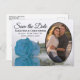 Ces magnifiques cartes postales sont un excellent moyen de faire savoir à vos amis et à votre famille de réserver la date de votre mariage imminent. Elles présentent un design élégant, chic et romantique avec une rose couleur bleu ciel, turquoise ou azur à longue tige se reflétant dans une mare d'eau, et votre photo dans un cadre ovale. La légende indique "Save the Date" avec un espace pour vos noms, la date et le lieu. Le verso comporte un graphique mignon "pencil us in" avec un espace pour une courte note et vos signatures.