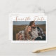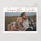 Cette carte de postale sienna brun mariage Enregistrez la date présente une couleur royale chaude au-dessus d'une photo de fiançailles automnales du couple heureux. Le beau script minimaliste bronzé présente une typographie cursive simple ainsi qu'une police serif moderne et chic. Ce brun doux est parfait pour un événement après-midi d'automne.