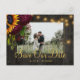 Des tournesols en or jaune, des roses bordeaux, et des cordes de lumières scintillantes sur une photo brun foncé élégant en bois de grange enregistrer la carte postale mariage date. ++++++++++ Facile à personnaliser avec vos noms et votre texte des deux côtés ! ++++++++++++ Convient pour le jardin extérieur fleuri été ou automne jardin rustique de campagne ou de ferme mariages à thème.