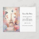 Carte postale de sauvegarde de date avec une image stylisée de la tour Eiffel entourée de jolis papillons et de délicates fleurs de jardin.
