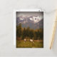 Une belle carte postale avec une scène paysagère de deux chevaux blancs broutant dans un pâturage de vallée à la base de montagnes enneigées.