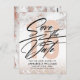 Carte postale moderne et tendance de Save The Date pour un anniversaire Sweet 16. Le design présente le numéro 16 en rose gold sur un fond en marbre rose gold et paillettes, avec une typographie script 'enregistrez la date' et des détails en caractères gras.