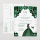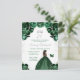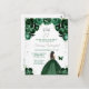 Cette invitation de fête d'anniversaire élégante et glamour présente une belle princesse à peau foncée dans une robe de bal vert foncé. Le texte combine une écriture manuscrite et des polices modernes sans serif pour un look classe et sophistiqué. Les arrangements floraux, le papillon et les confettis argentés créent le mélange parfait de rustique et de chic.