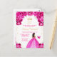 Cette invitation de fête d'anniversaire élégante et glamour présente une belle princesse à peau noire dans une robe de bal rose vif. Le texte combine une écriture manuscrite et des polices sans serif modernes pour un look classe et sophistiqué. Les arrangements floraux, le papillon et les confettis dorés créent le mélange parfait de rustique et de chic.