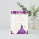 Cette invitation de fête d'anniversaire élégante et glamour présente une belle princesse aux cheveux bruns et à la peau claire dans une robe de bal violette foncée. Le texte combine une écriture manuscrite et des polices modernes sans serif pour un look classe et sophistiqué. Les arrangements floraux, les papillons et les confettis dorés créent le mélange parfait de rustique et de chic.
