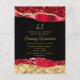 Cette invitation d'anniversaire élégante et glamour présente de fausses larmes de glamour scintillantes rouges et or sur fond noir. Le texte combine une écriture manuscrite et des polices modernes sans serif pour un look classe et sophistiqué.