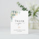 Une carte de remerciements nuptiale moderne et élégante. Un arrière - plan blanc chic. Décoré de feuilles d'eucalyptus couleur verte, de sprigs, de verdure et de faux sprigs dorés. Texte noir. Sur le devant le texte : Merci, nom, et une date. Retour : Modèle pour Votre mot de remerciement et nom.