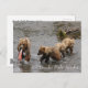 Cette carte postale capture une vue remarquable et quelque peu rare à Brooks Falls dans le parc national Katmai, en Alaska : un ours brun maternel avec trois jeunes petits en remorque. Elle porte une partie d'un saumon, tandis que ses trois bébés impatients suivent de près, essayant d'obtenir un goût. La scène présente les défis et les récompenses de la maternité dans la nature, et la spécialité d'un ours brun ayant trois petits.