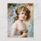 Jolie fille victorienne avec grand arc bleu dans ses cheveux. Elle tient un nid de petits oeufs bleus.