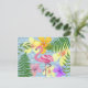 Beau flamant rose en combinaison avec coloré, aquarelle, fleurs tropicales et feuilles de palmiers. Luau, adorable, motif rayé bleu, carte postale d'été.