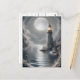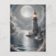 Un phare est haut sur des rochers, éclairé par la lune. L'eau reflète le ciel nocturne, créant une atmosphère sereine.