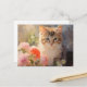 Jolie carte postale aquarelle de fleurs d'oeillet et de chaton. Œillets roses et rouges en aquarelle numérique avec un adorable chaton tigré. Carte postale de vœux d'anniversaire parfaite pour toute personne née en janvier, car l'oeillet est la fleur de naissance de janvier !