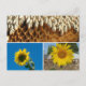 Tournesol amour. L'image du dessus est une tête de fleur séchée montrant des graines et des cellules vides. En bas à gauche montre une fleur mature contre un ciel bleu. Le coin droit est une floraison entière avec des bâtiments et des arbres en arrière - plan.