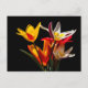 Bouquet de tulipes colorées ensoleillées de couleurs jaune, rouge, violet sur fond noir.