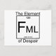 La science a isolé un nouveau produit chimique dans le tableau périodique - l'élément de désespoir, abrégé en FML. Cette substance extrêmement volatile provoque de mauvaises journées de cheveux, des bagarres, de l'ironie, des sentiments d'impuissance et des exclamations exaspérées de "F*ck my life!." Chimie d'argot pour les masses - un cadeau parfait pour une mauvaise journée!