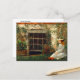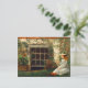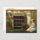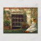 Carte postale d'art avec le tableau, The Four-Leaf Clover (1873), de Winslow Homer (1836-1910), artiste américain du mouvement du réalisme. Une fille en robe blanche avec un bonnet en paille assise près d'une vitre vitrée tenant un trèfle à quatre feuilles, à côté des planteurs de géraniums.