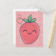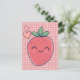 Un drôle de fraise de dessin animé avec le sourire le plus mignon, un visage rouge et des feuilles verts sur le dessus avec le coeur d'amour rose.