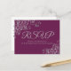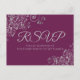 Ces belles cartes postales RSVP faciliteront la réponse de vos invités à votre faire-part de mariage avec soit le nombre de participants et une sélection de repas, ou d'envoyer leurs regrets. Le design est simple mais élégant avec du texte gris argenté et une bordure florale en fibre de feuille argent en dentelle sur un arrière - plan mauve magenta ou cassis.
