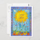 Une carte postale colorée et brillante décorée d'une illustration inspirée du Solstice d'été avec un soleil éclatant sur les fruits et légumes frais dessinés à l'encre et peints à l'aquarelle.