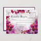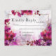 La carte de mariage RSVP, une pièce essentielle de la "Fuchsia Enchantment : Watercolor Mariage Suite", présente un avant délicieux orné d'un décor pittoresque de fleurs fuchsia et de lierre. En haut, une légende en gras commande l'attention : "Répondez s'il vous plaît." En dessous, la date de réponse est indiquée avec élégance, donnant le ton pour des réponses rapides. En dessous de ces détails, il y a suffisamment d'espace pour que les invités puissent insérer leur nom et indiquer s'ils acceptent ou refusent l'invitation, assurant ainsi une réponse transparente et organisée. Un arrière - plan blanc, propre et net, se tourne vers le dos. Ici, un espace bien pensé est prévu pour le récepteur de carte afin de s'adresser à l'avance à la carte RSVP, ce qui simplifie le processus pour les invités. Cette conception pratique garantit que la carte RSVP "Fuchsia Enchantment : Watercolor Mariage Suite" non seulement capte l'essence de la célébration, mais facilite également un mécanisme de réponse fluide et efficace pour les invités invités