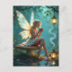 Une carte postale sucrée pour rester en contact avec des amis et des membres de la famille avec une fée assise sur une msurhoom dans une forêt enchantée éclairée par des lanternes buvant une tasse de café chaude.