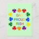 Cette carte postale présente une image graphique d'une sélection de shamrocks de couleur arc-en-ciel encerclant un message de couleur arc-en-ciel qui dit "Gay Proud Irish". Le design s'adresse à tous les Irlandais LGBT qui aiment leurs racines irlandaises et sont fiers d'être gays.