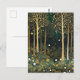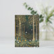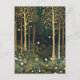 Une scène de forêt fantastique et enchanteresse avec une palette verte et dorée. De grands arbres stylisés avec des troncs et des branches dorés atteignent un ciel sombre, leurs membres ornés de fruits ou de fleurs sphériques brillants. Le premier plan est une dense tapisserie de feuillage détaillé, remplie de fleurs stylisées et de plantes dans les tons vert, crème et or chatoyant. Des orbes lumineuses flottent dans l'air et se reposent sur le sol, créant une atmosphère magique qui rappelle un bois onirique. L'ensemble est très décoratif, avec une perspective plate et des motifs complexes qui remplissent la toile.