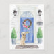 Annoncez votre nouvelle adresse avec notre faire-part élégante avec un Golden Retriever, une porte d'entrée bleue, un tapis de bienvenue, une ardoise, des topiaires et une couronne fleurie posée sur un arrière - plan en brique grise.