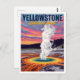 A dramatic, retro-style travel poster illustration of Yellowstone National Park, focusing on the Grand Prismatic Spring or a geyser eruption. The image captures the vibrant, fiery colors of the mineral-rich pool, with a tall plume of white steam rising against a colorful sunset sky filled with pink, orange, and deep blue clouds. The text "Yellowstone National Park" is centered at the top.