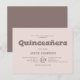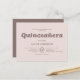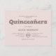 Célébrez cette étape spéciale avec une invitation minimaliste et élégante de quinceañera. Le titre "Quinceañera" est joliment rendu dans une police serif en dalle ludique, tandis que les détails de l'événement sont dans une police serif raffinée. Parfait pour une célébration sophistiquée et joyeuse.