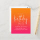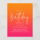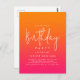 Célébrez votre anniversaire avec audace et dans un style magnifique ! Cette invitation d'anniversaire personnalisée imprimée sur une carte postale fait exactement cela avec ses couleurs dégradées orange vif et rose chaud, associées à un texte moderne blanc et un accent de lettrage manuscrit qui épelle le mot "anniversaire" dans un style fabuleux. Les couleurs ressemblent à un lever de soleil et à l'aube d'une nouvelle ère ! Ces invitations peuvent être commandées à la fois dans des formats imprimés et numériques en téléchargement instantané.