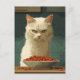 L'image représente un chat blanc à l'expression sérieuse, presque mécontente, regardant attentivement un bol complet de nourriture pour chat devant lui. L'arrière - plan est carrelée de vert foncé, ce qui ajoute à l'atmosphère concentrée et légèrement dramatique. La fourrure du chat est détaillée, et ses yeux verts sont rétrécis, ce qui lui donne une présence forte et commandante. Le style général rappelle l'art vectoriel, avec des lignes épurées et des couleurs audacieuses.