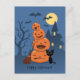 Un mignon chat noir et un balai de sorcière près d'une pile de citrouilles riants qui tombent. Un arbre mort, un manoir déplaisant, des chauves-souris et la lune sont vus sur l'arrière - plan.