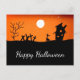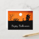 Carte postale Happy Halloween Greeting, avec une image de filk noir et orange d'une sorcière et d'une maison hantée. Avec une élégante typographie de script blanc, vous pouvez ajouter votre propre texte. Une carte vintage d'inspiration mignonne pour envoyer vos souhaits d'Halloween !