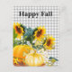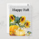 Cette carte postale de l'automne présente des fleurs de soleil et des citrouilles sur un arrière - plan en vichy marron.
