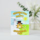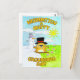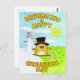 This cute Groundhog Day card features Punxsutawney Phil in a black tophat coming out of the ground. On its left there is a snowman and it's snowing. On its right the sky is blue, the sun is shining and the flowers are blooming like in Spring. On the card is written "Wishing you a happy Groundhog Day".