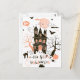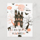 Parfait pour Halloween ! Ce joli design est orangé et noir avec un avant et un centre hantés de la maison, avec deux arbres nus de chaque côté. Une lune complète, avec un fantôme disant BOO, une chauve-souris, un jack o'lanterne sur la pelouse et un chat noir, le tout ajoute à l'ambiance d'Halloween.