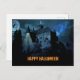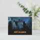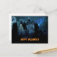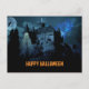 La carte postale thématique d'Halloween présente une peinture numérique artistique d'un manoir hanté effrayant sur la colline avec un ciel bleu foncé et gris. Superposition de texte de style de grunge personnalisable